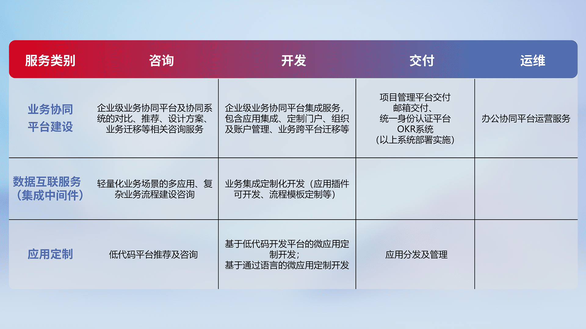 针对钉钉、、、、企微、、、、IDaas等平台级产品提供产品的规划、、、方案、、交付、、、定制化开发等服务,,,实现如统一协同办公、、、智能客户服务、、混合会议管理、、智能数据查询、、等业务场景,,,实现数字化转型。。。